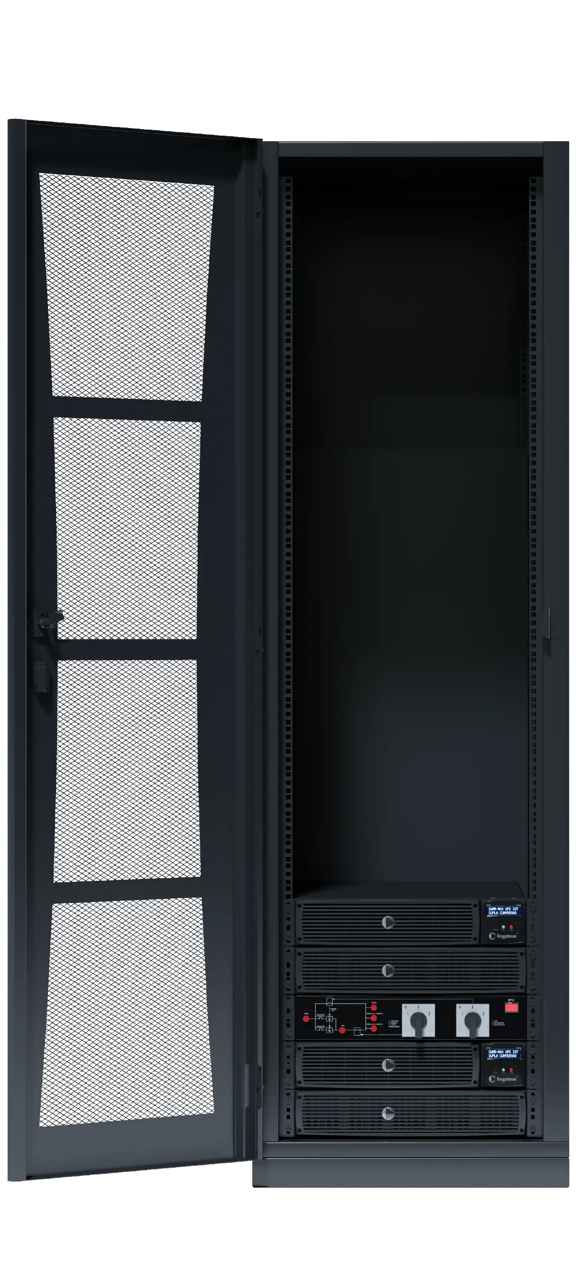 Soluciones de rack con SAI/UPS modular de Engetron para hasta 6 horas y rangos de hasta 35U disponibles para cargas de TI, además de una completa línea de accesorios para optimización del espacio.